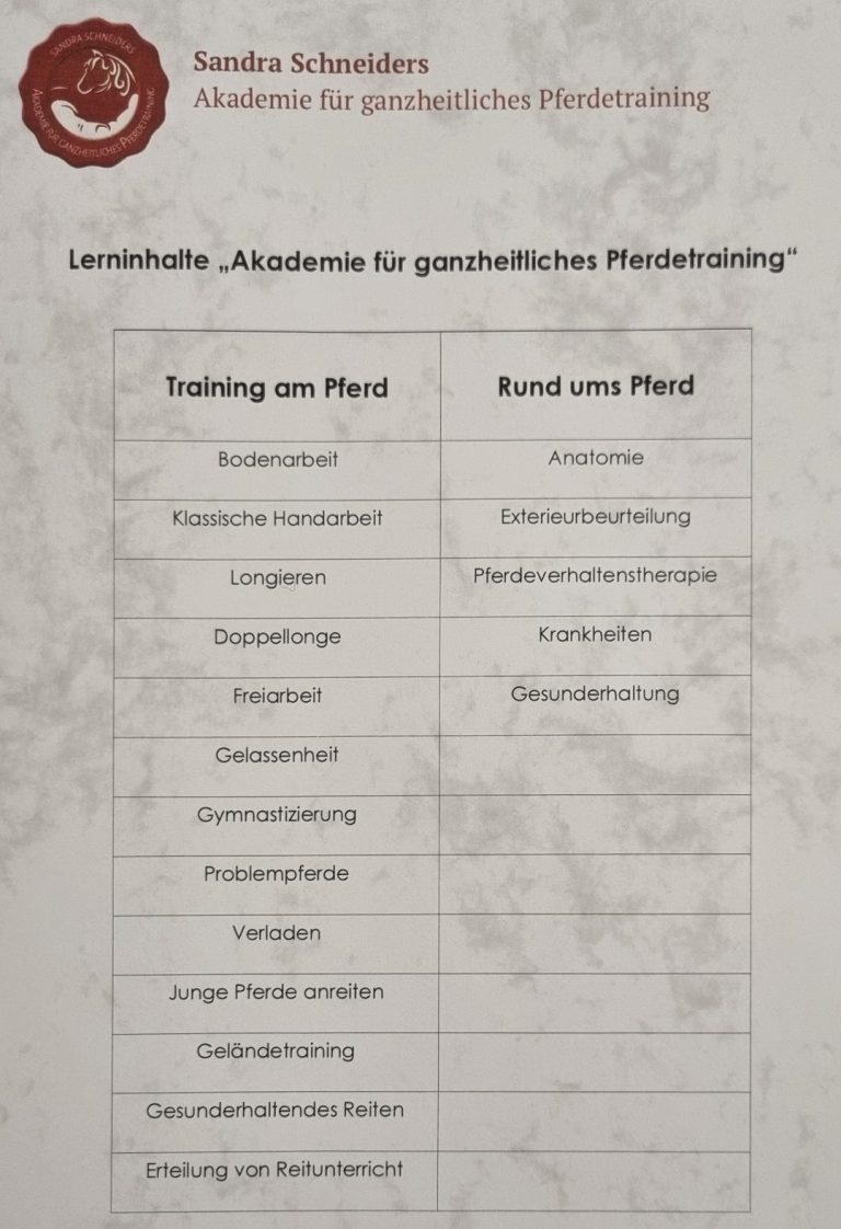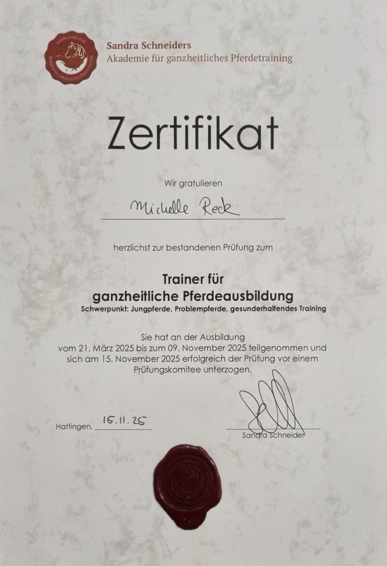 2025 schloss ich schließlich meine Ausbildung zur ganzheitlichen Pferdetrainerin an der Akademie von Sandra Schneider ab – mit dem Schwerpunkt auf Jungpferde, Problempferde und gesunderhaltendes Training.